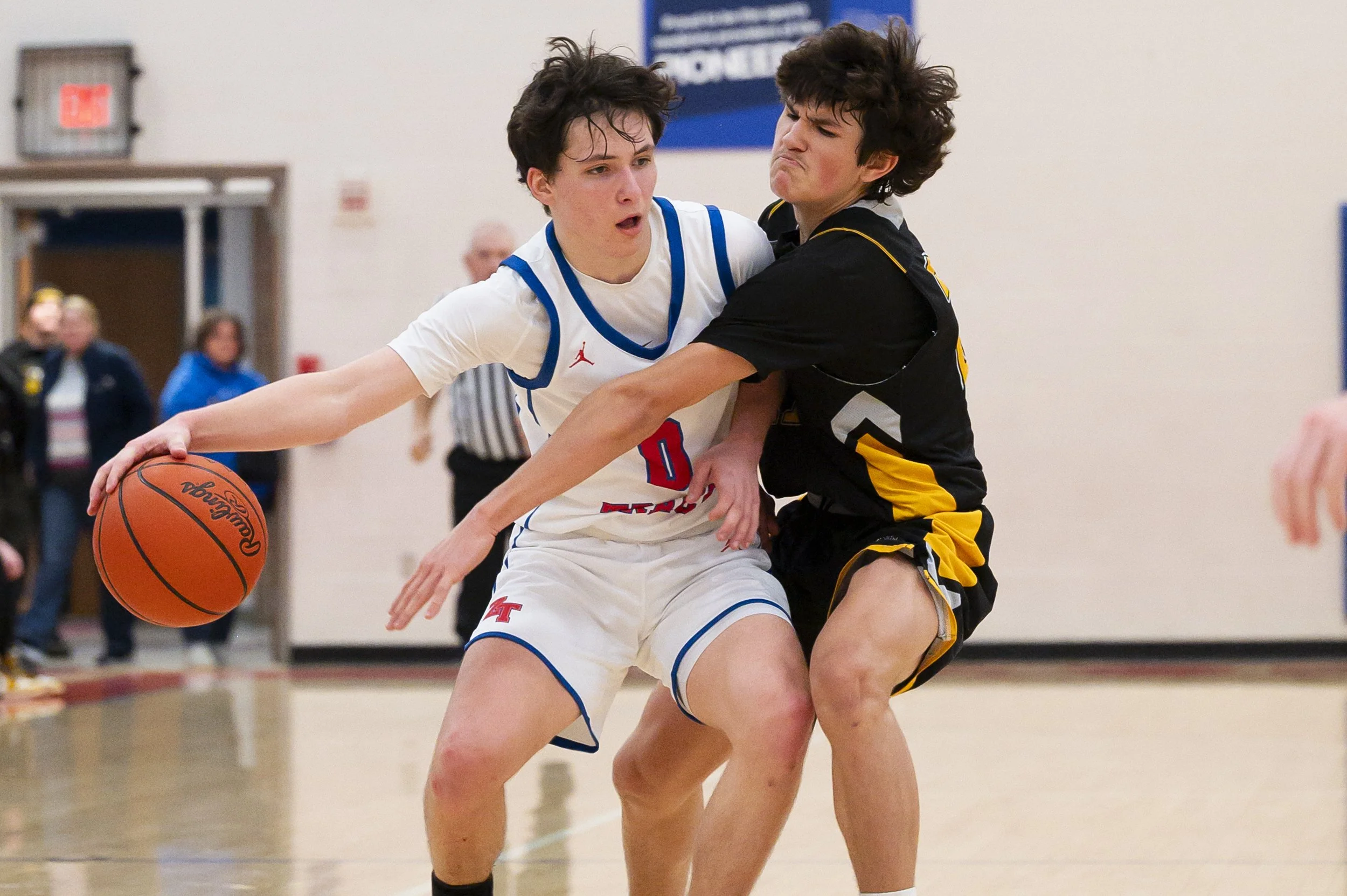 Logan Swackhammer embraces fellow teammate Peyton Hill after a 57-44 victory over Zane Trace High School. Unioto basketball remains undefeated in SVC for 69 straight league wins.