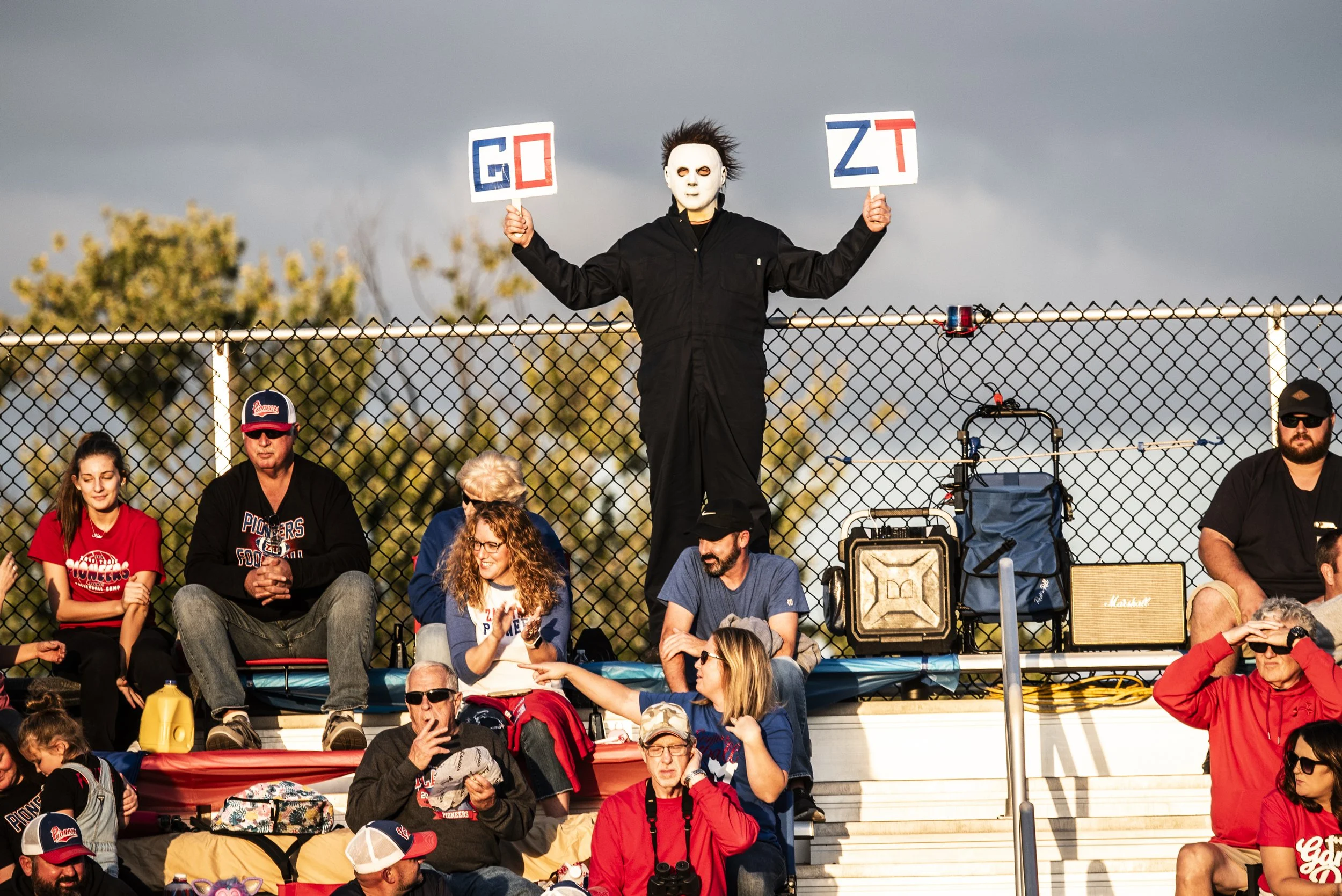 (L-R) Adena students Jarrett Garrison, Dylan Gallaugher, Brandon Smith, and Emmitt Cunningham, along with several other students, rush the track and dance as they wait out a lightning delay against Washington Courthouse during the first home football game on Sept. 15, 2019. Adena would defeat Washington Courthouse 39-18 at Frankfort, Ohio.